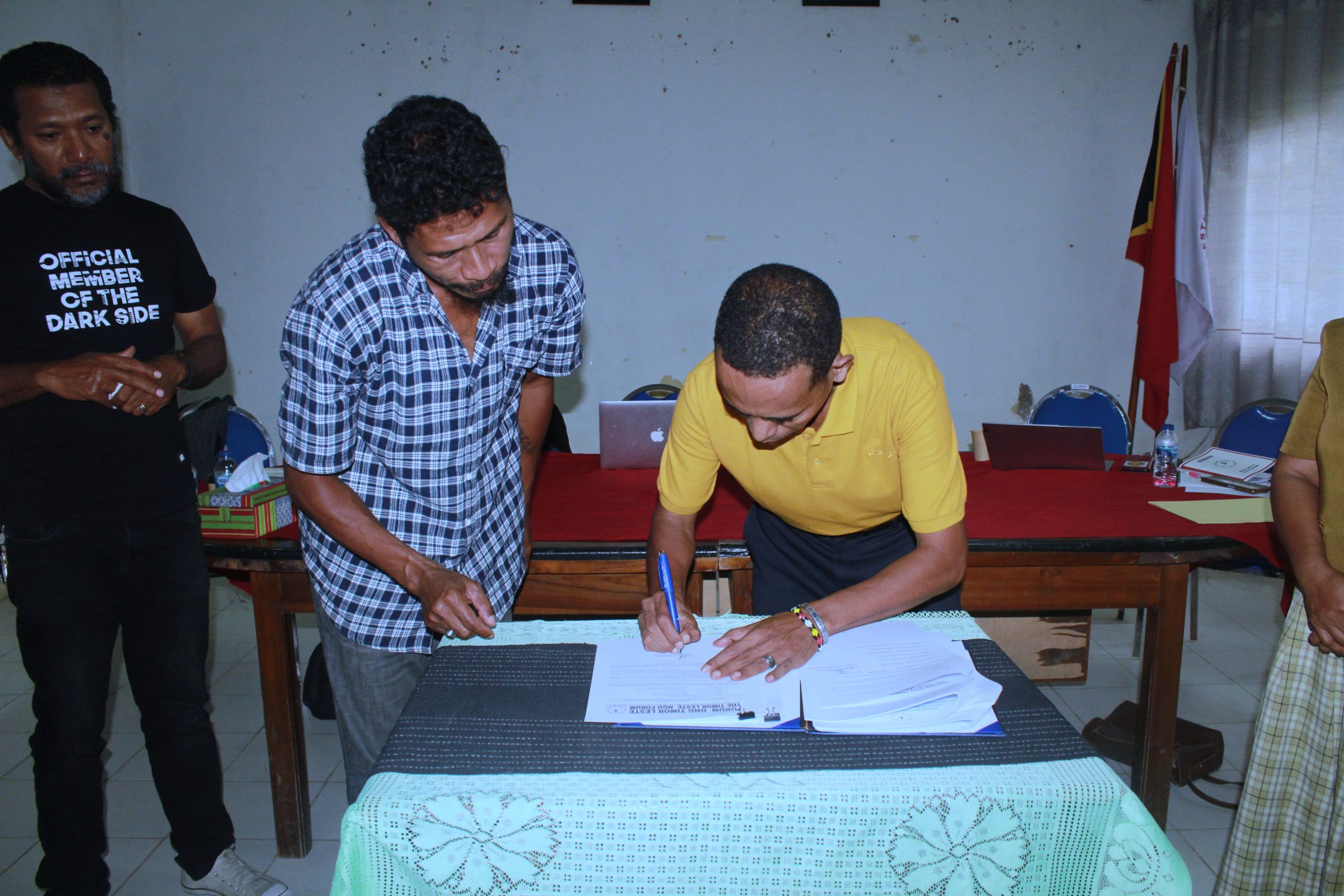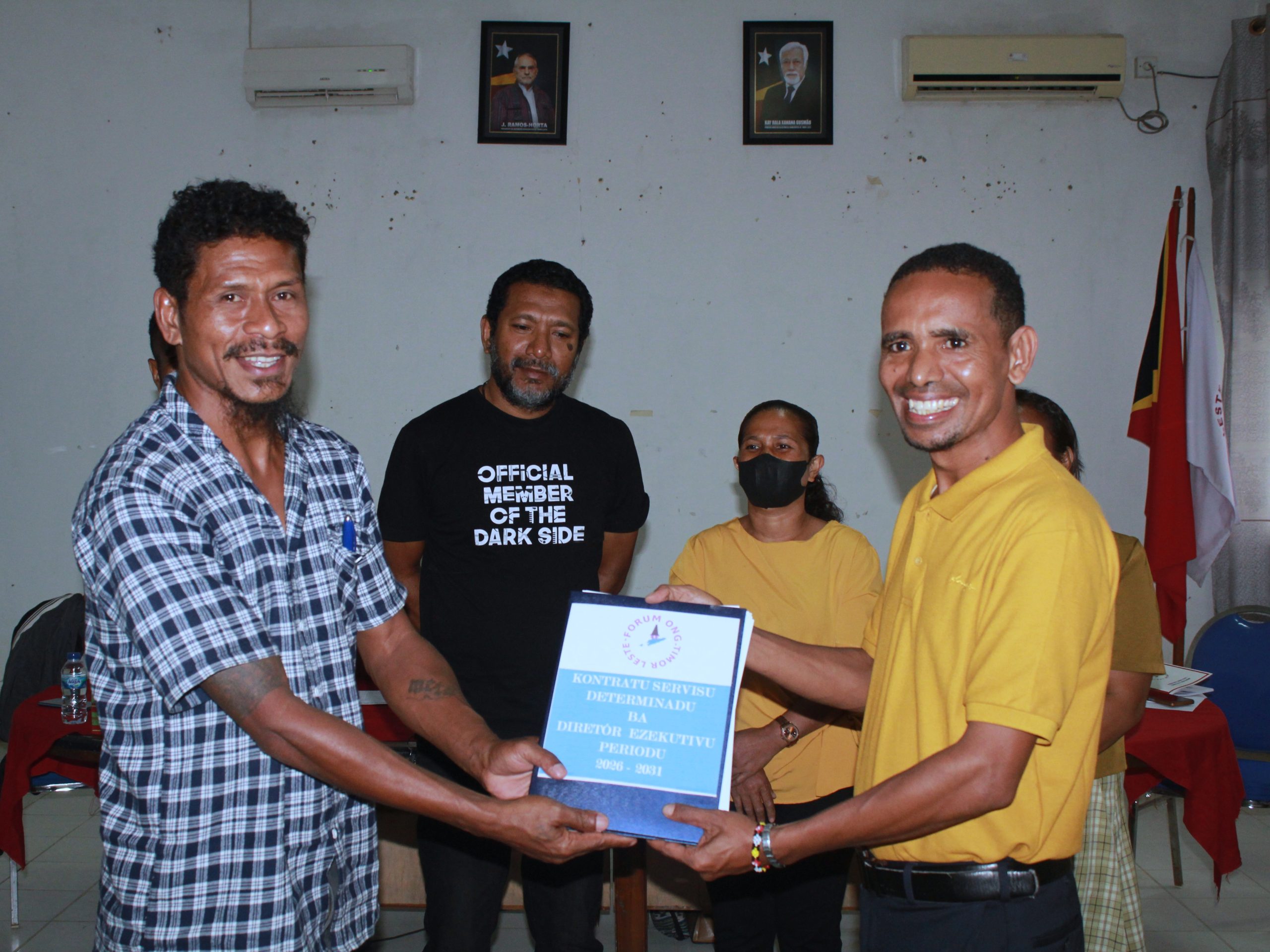 Kinta – Feira, loron 09 abril 2026, iha Salaun Edifisiu FONGTIL, Caicoli Dili, Forum Organização Não Governamental Timor-Leste (FONGTIL) hala’o ona serimónia asina Akordu kontratu servisu entre Konsellu Fiskal FONGTIL ho Sr. Inocencio de Jesus Xavier nu’udar Diretór Ezekutivu foun ba mandatu 2026–2031.